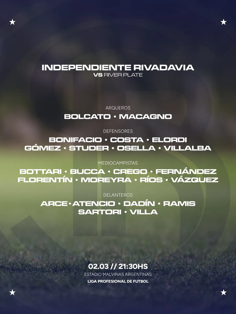 Independiente Rivadavia: Nicolás Bolcato; Alejo Osella, Iván Villalba, Leonard Costa, Sheyko Studer, Juan Manuel Elordi; José Florentín, Gonzalo Ríos, Matías Fernández; Fabrizio Sartori y Sebastián Villa DT: Alfredo Berti.
