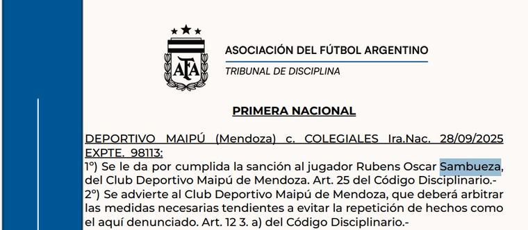 "Se da por cumplida la sanción al jugador Rubens Oscar Sambueza, del Club Deportivo Maipú de Mendoza. Art 25 del Código Disciplinario. Se advierte al Club Deportivo Maipú de Mendoza, que deberá arbitrar las medidas necesarias tendientes a evitar la repetición de hechos como el aquí denunciado", comunicó la entidad.