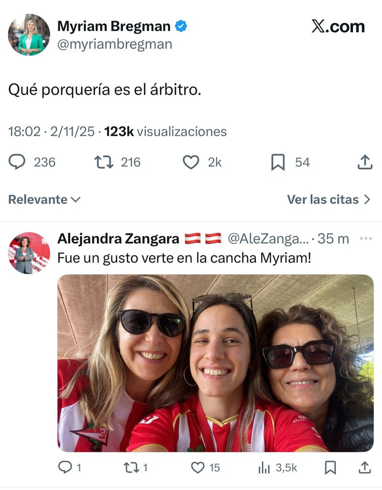 "Qué porquería es el árbitro", fue el posteo en X de la abogada, defensora de las libertades democráticas y de trabajadores, que es conocida por combinar su rol político con su pasión por el fútbol. Hincha confesa del Pincha, Bregman no suele ocultar sus opiniones sobre los encuentros que involucran a su club.