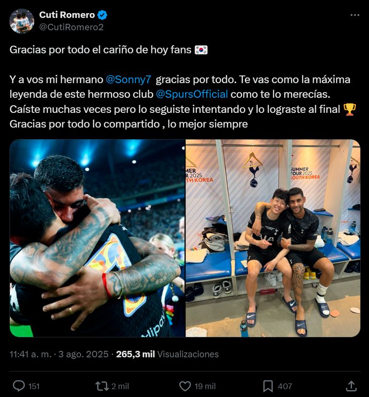 "A vos, mi hermano Sonny, gracias por todo. Te vas como la máxima leyenda de este hermoso club, Tottenham, como te lo merecías. Caíste muchas veces, pero lo seguiste intentando y lo lograste al final. Gracias por todo lo compartido, lo mejor siempre", escribió el Cuti Romero en su cuenta de X a modo de último adiós.
