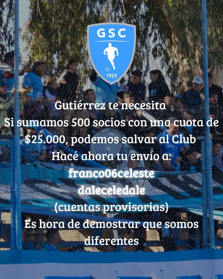 Gutiérrez transita una crisis sin precedentes desde que juega torneos federales. Un grupo de hinchas se organizó y pretende asociar a 500 personas, para recolectar más de 12 millones.