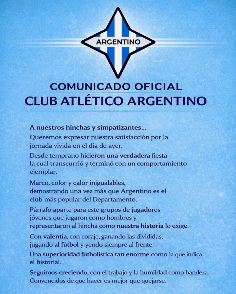 En el comunicado, Argentino destacó la jornada vivida y el acompañamiento de su gente, pero rápidamente puso el foco en lo que ocurrió dentro del campo. “Jugaron como hombres”, señalaron sobre sus futbolistas, resaltando la actitud y el carácter en el clásico.