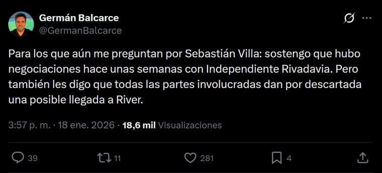 Curiosamente, el mismo día que Balcarce anunció el sondeo desde Núñez por Villa, también anticipó en el mismo tuit que el pase finalmente no se concretaría: "En River aseguran que no va a llegar al club, y pienso lo mismo. Dicho eso, sostengo que la situación de él se averiguó", había apuntado en aquella oportunidad.