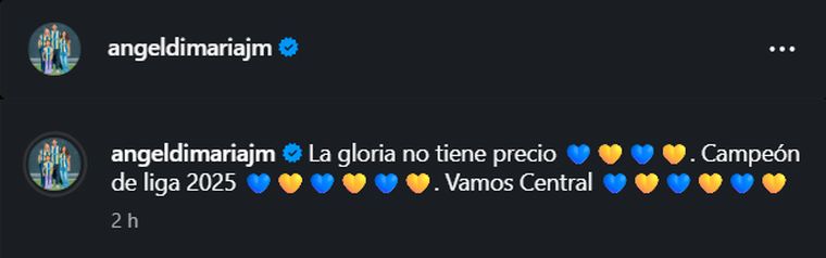 Tras conocerse públicamente la consagración, Di María hizo un posteo en su cuenta de Instagram en el que escribió: "La gloria no tiene precio. Campeón de Liga 2025. Vamos Central", junto a corazones amarillos y azules. Más allá de las felicitaciones de sus conocidos y los festejos de los hinchas propios, la publicación se llenó rápidamente de comentarios críticos e incluso insultos al campeón del mundo por el modo en que se terminaron dando las cosas.