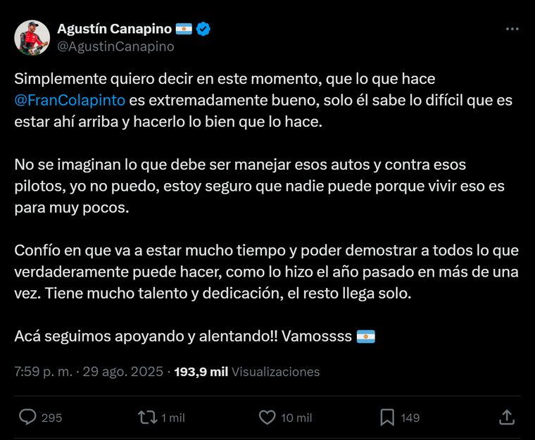 El posteo de Agustín Canapino en apoyo a Franco Colapinto