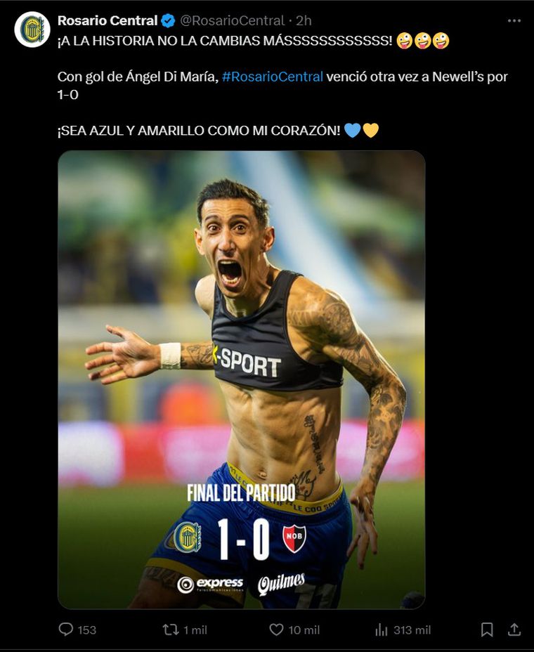 Esta sábado, Rosario Central volvió a ganarle el clásico a Newell's, algo que se está volviendo una moneda demasiado corriente en el último tiempo. Fue por 1-0 con un golazo de Ángel Di María de tiro libre al minuto 82. Los fanáticos, por supuesto, se regodearon sobre su rival derrotado; pero el propio club tampoco se quedó atrás.