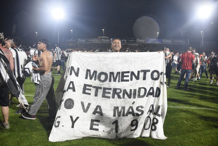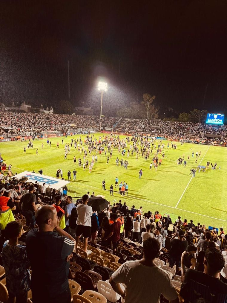 Ni bien se concretó el ascenso, muchos de ellos se volcaron al césped del estadio para pedir una foto con los ídolos del ascenso y ser parte del festejo. Algunos se cruzaron con los jugadores del Deportivo Madryn, que ya comenzaban a retirarse.