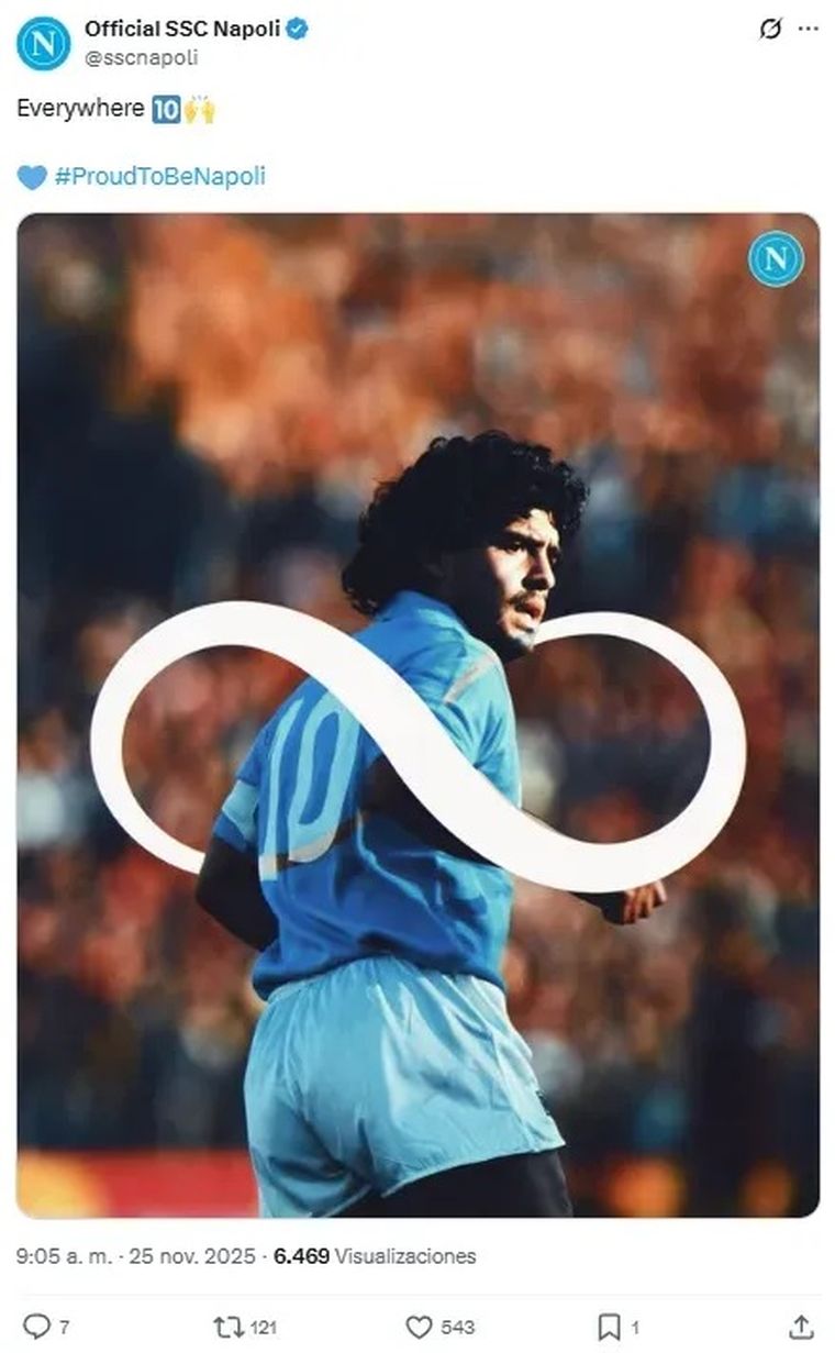 El homenaje también llegó desde Italia. Napoli, el club europeo que más lo identifica, eligió un mensaje breve y contundente: “Everywhere”, acompañado por una imagen del ídolo.