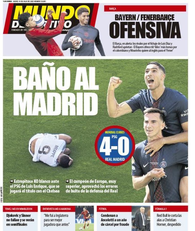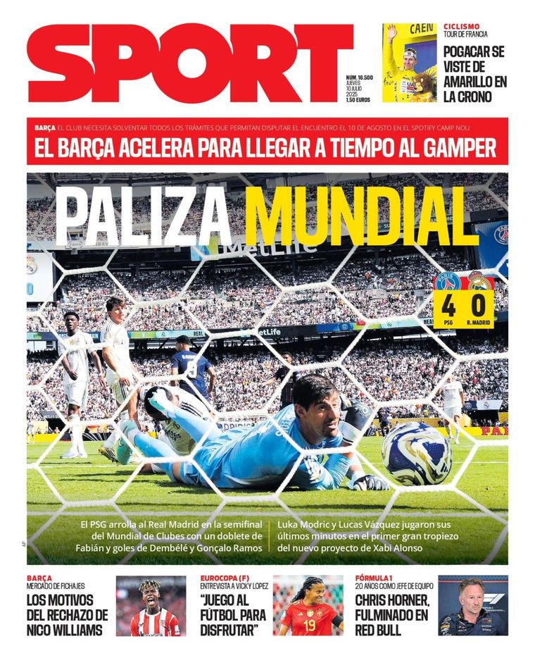 Sport, por su parte, tituló con un tajante "Paliza Mundial", y analiza en portada: "El PSG arrolla al Real Madrid en la semifinal del Mundial de Clubes con un doblete de Fabián y goles de Dembélé y Gonçalo Ramos".