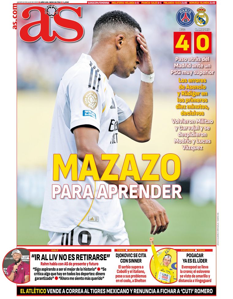 Siguiendo con la prensa madrileña, As encaró con un breve pero conciso "Mazazo para aprender" como encabezado, junto a una foto de Mbappé tapándose la cara. "Paso atrás del Madrid ante un PSG muy superior. Los errores de Asencio y Rüdiger en los primeros diez minutos, decisivos", rezan los comentarios al margen.
