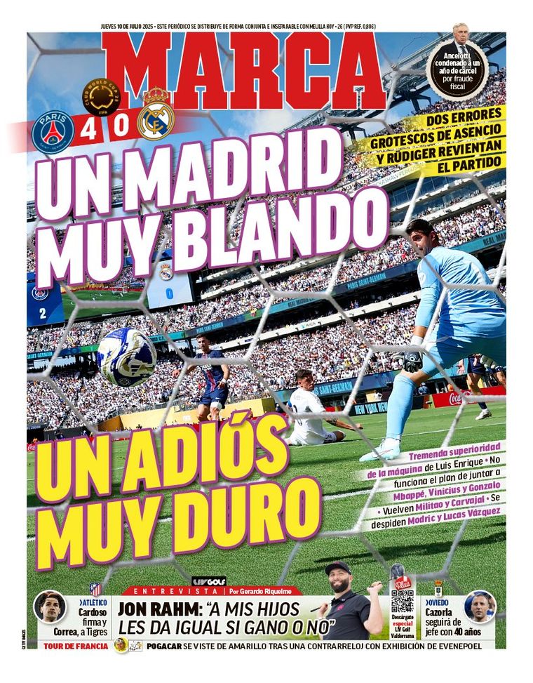 Marca, el diario deportivo más importante de toda España, con sede en la capital ibérica, fue tajante: "Un Madrid muy blando, un adiós muy duro", titularon. "Tremenda superioridad de la máquina de Luis Enrique. No funciona el plan de juntar a Mbappé, Vinicius y Gonzalo (García)", agregan al respecto en la portada.
