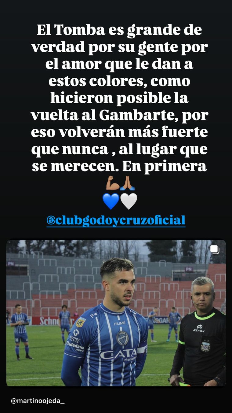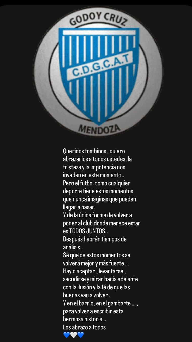 Tras el descenso de Godoy Cruz a la Primera Nacional, consumado este sábado por la tarde tras el empate ante Deportivo Riestra en el Feliciano Gambarte, muchos ex futbolistas de la institución dejaron su mensaje de aliento.