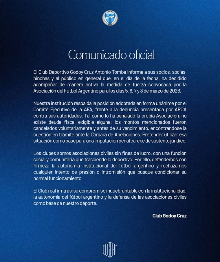Los antecedentes recientes refuerzan esa percepción. Atlético Tucumán cuestionó arbitrajes y, en cuestión de horas, volvió a la órbita oficialista. El propio Godoy Cruz Antonio Tomba, cuando sus futbolistas alzaron la voz por decisiones arbitrales, vio a su dirigencia desmarcarse con rapidez quirúrgica y reafirmar su respaldo institucional.