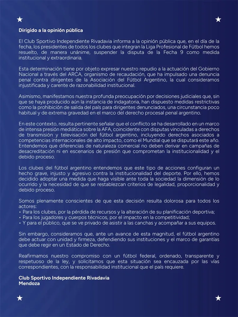 En ese tablero, los clubes mendocinos no eligieron el silencio: eligieron el alineamiento. Independiente Rivadavia, Gimnasia y Esgrima, Godoy Cruz Antonio Tomba y Deportivo Maipú adhirieron a la medida. Y la pregunta incómoda no es por qué lo hicieron, sino qué otra cosa podían hacer.