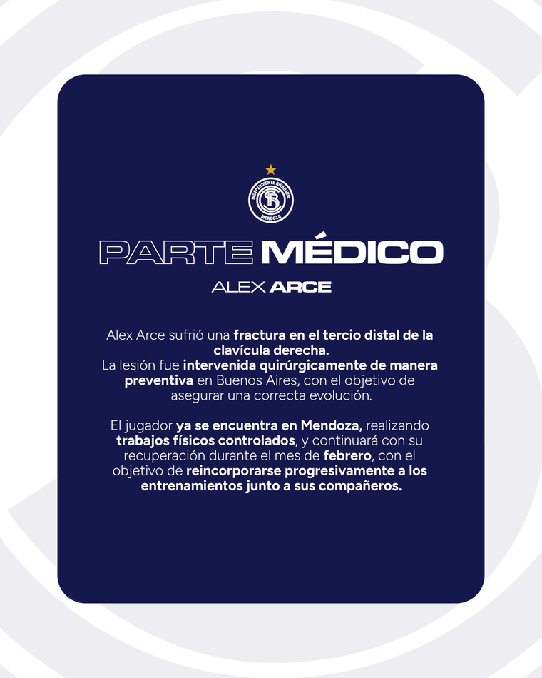 "Alex Arce sufrió una fractura en el tercio distal de la clavícula derecha", confirmó el comunicado publicado en la cuenta oficial. Agregaron además que la lesión fue "intervenida quirúrgicamente de manera preventiva en Buenos Aires, con el objetivo de asegurar una correcta evolución".