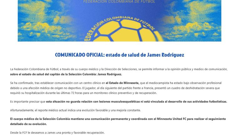 El comunicado oficial sobre el estado de salud de James Rodríguez