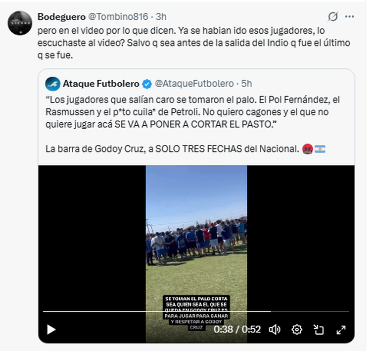Como si eso no alcanzara, también trascendió que algunos futbolistas del plantel asistieron a la cancha para presenciar un partido de Independiente Rivadavia, lo que alimentó aún más el malestar de un sector de la parcialidad bodeguera en un momento deportivo delicado.