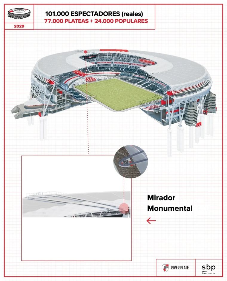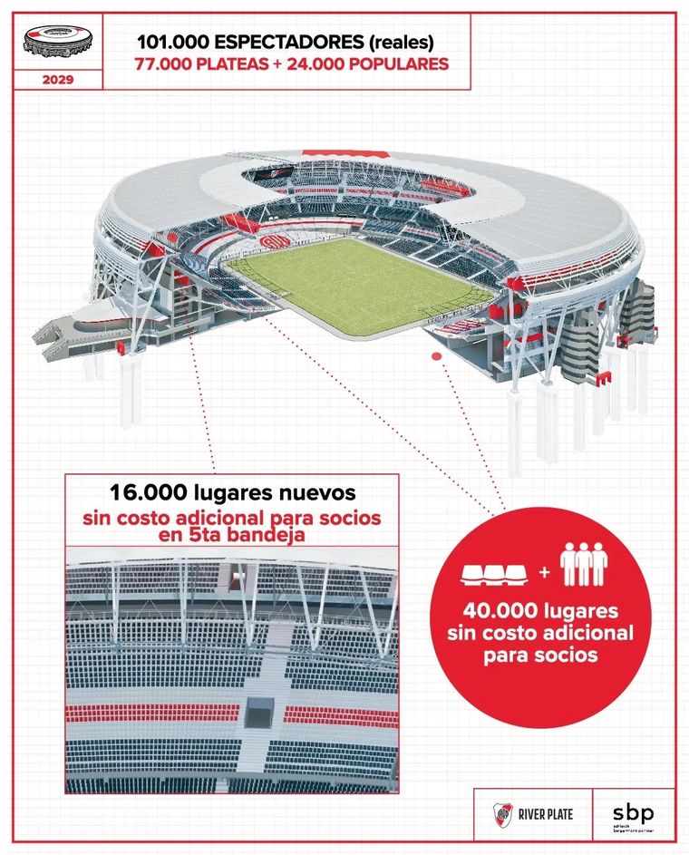 En paralelo, también se avanzará con la construcción de una quinta bandeja con 13 filas de plateas y nuevos accesos mediante torres con ascensores y estructuras metálicas en forma de “V”. La fachada será renovada con un diseño moderno de aluminio y curtain wall, mientras que el techo tendrá una cubierta metálica con membrana traslúcida y la clásica banda roja.