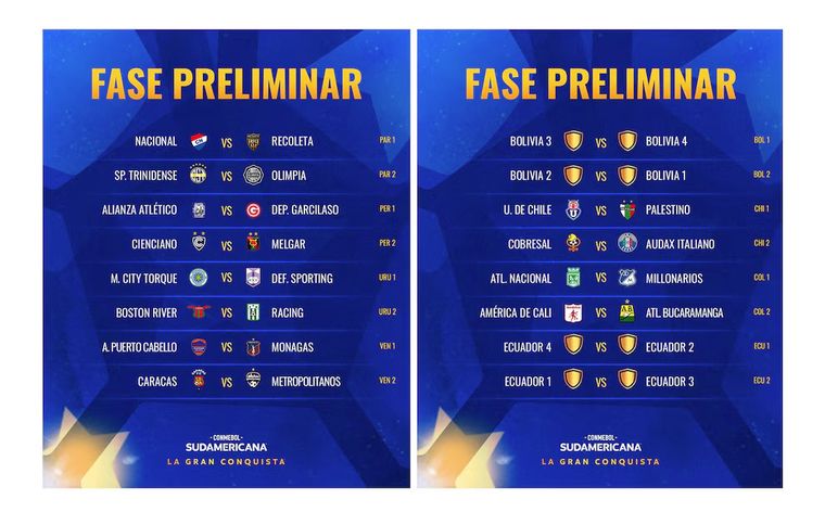 Por Argentina, los clasificados a la Sudamericana son River, San Lorenzo, Deportivo Riestra, Barracas Central, Racing y Tigre, que ingresarán directamente a la fase de grupos.