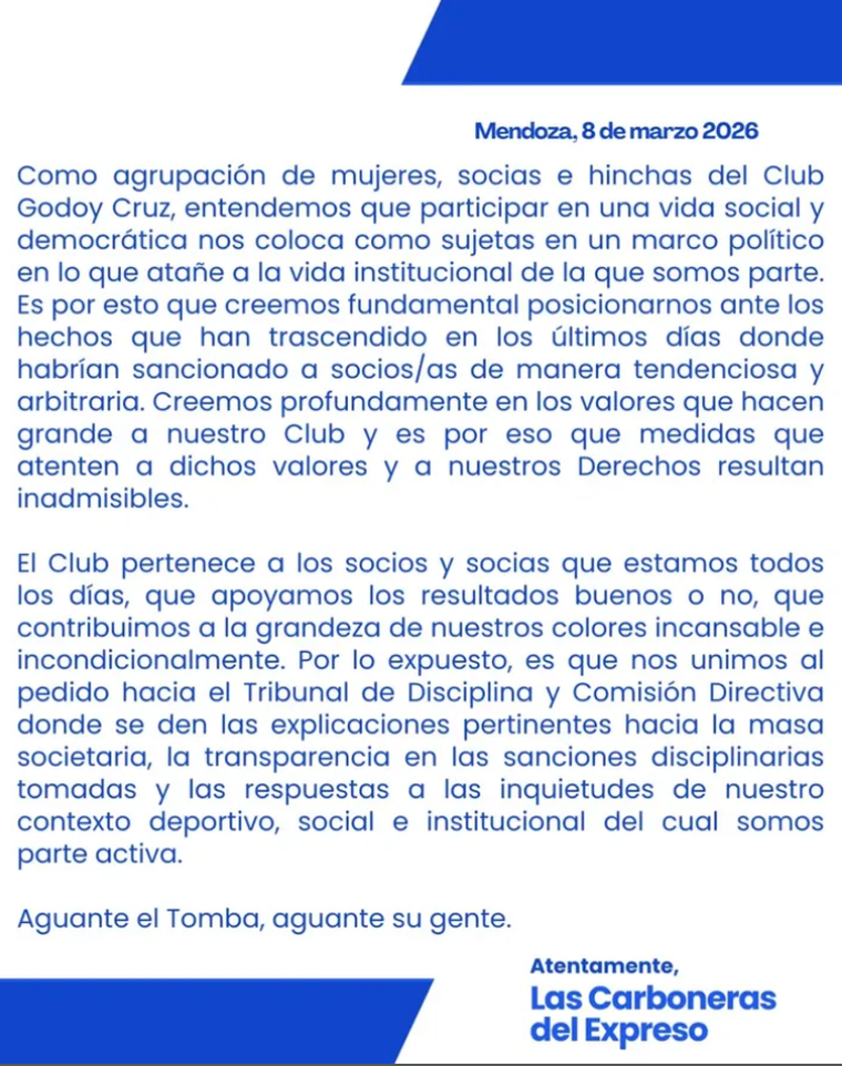 En los últimos días, el clima en el Club Godoy Cruz se volvió tenso tras la difusión de sanciones dirigidas a un grupo de socios, presentadas oficialmente como consecuencia de los incidentes ocurridos en el partido frente a Deportivo Madryn. Sin embargo, varias agrupaciones y miembros de la comunidad del club aseguran que muchas de estas medidas no tienen relación con ese encuentro, sino con hechos previos.