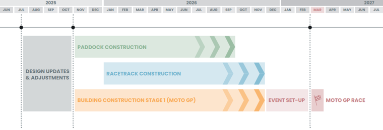 Finalizada esa etapa, a principios de noviembre de este mismo año está proyectado el inicio de la construcción del paddock del circuito, cuyas obras se estima que concluirán entre fines de septiembre y comienzos de octubre de 2026. Al mismo tiempo, comenzarán también las obras de los edificios destinados a hospitality, que se prevé estarán terminadas entre fines de noviembre y comienzos de diciembre de 2026.