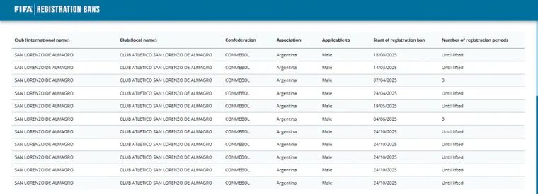 En las últimas horas, se dieron a conocer unas nuevas inhibiciones que la FIFA le impuso al Ciclón y por las cual ya acumula un total de once, según figura en el sitio web oficial del ente madre del fútbol internacional, lo que lo convierte en el segundo club más penalizado del continente, solo por detrás de San José de Oruro de Bolivia.