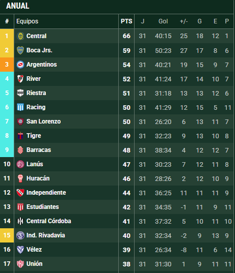 Con una fecha por disputar, los de Marcelo Gallardo quedaron cuartos, con 52 puntos, detrás de Central (66), Boca (59) y Argentinos (54). Para recuperar su lugar, River está obligado a ganarle a Vélez en Liniers y esperar que el Bicho pierda frente a Estudiantes en La Plata. Si los de Nicolás Diez empatan, la definición será por diferencia de gol, que hoy favorece al conjunto de La Paternal por dos tantos (+19 contra +17).