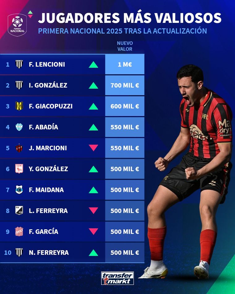 En otra publicación realizada el mismo día, la página destaca a Gimnasia y Esgrima como el equipo más valioso del 2025 en la segunda categoría del fútbol argentino, con un valor de casi 6 millones de euros. Completan ese podio San Martín de Tucumán, con 4.72 millones de euros y Estudiantes de Río Cuarto, con 4.38 millones.
