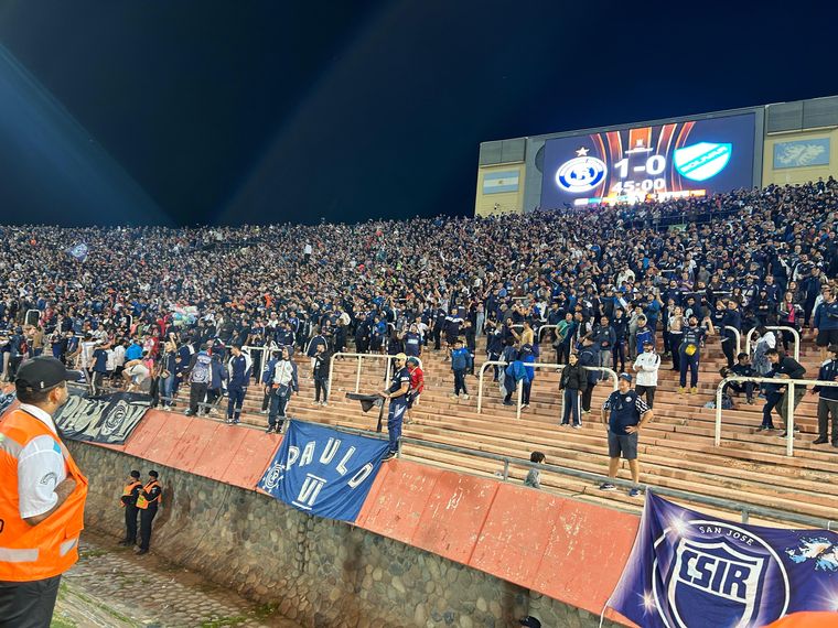 El Malvinas Argentinas lució imponente desde temprano, con un marco de público que fue creciendo hasta convertirse en una verdadera marea azul. Banderas colgadas en cada rincón, camisetas que coparon las tribunas y un color que le dio identidad a una noche que ya era especial desde la previa.