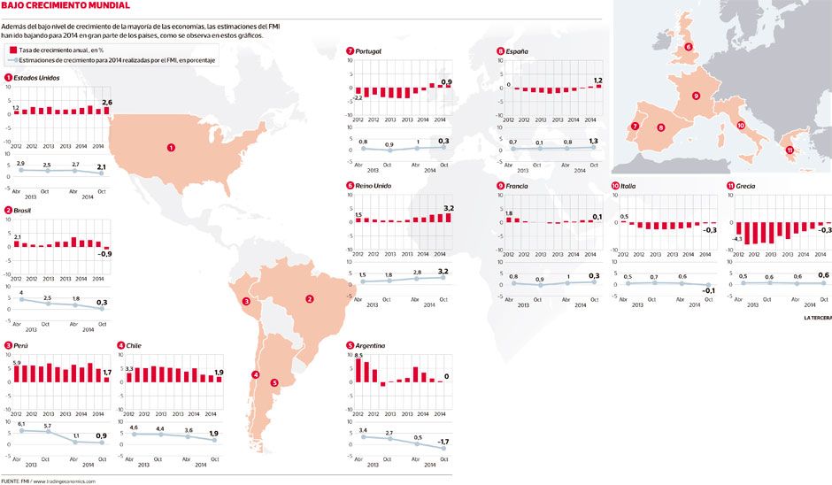 - El organismo redujo su proyección de crecimiento global para este año a 3,3%, desde un 3,7%, y también las redujo para 2015 a un 3,8%. El FMI apuntó que el principal responsable de esta amplia reducción es la débil expansión en China, Europa, Japón y América Latina, especialmente Brasil.