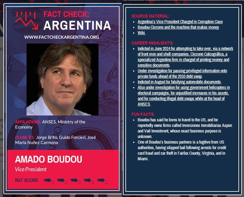 El juego, Fact Check: Argentina, es propiedad de ATFA, Lobby de los fondos buitre en Washington, y se compone de tarjetas en las que figuran empresarios asociados al gobierno nacional y hasta el vicepresidente argentino, Amado Boudou.