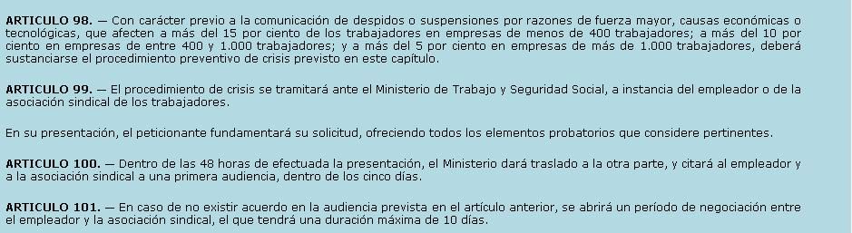 De todas maneras, el abogado comentó que, antes "la empresa deberá actuar conforme al artículo 98 de la Ley 24.013 (de Empleo) y aplicar el procedimiento preventivo de crisis".