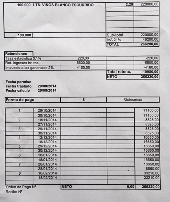 De un total de $100.000 litros de vino blanco escurrido se obtienen $220.000 a lo que se le carga un IVA de $46.200 y se le retienen $10.980, quedando un total de $255.220 que se le financian al comprador en 8 pagos.