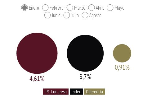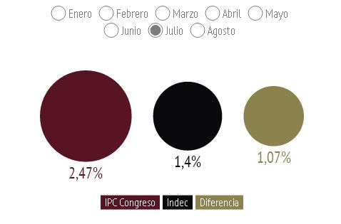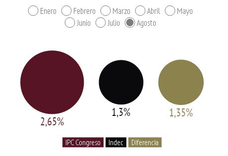 De este modo, el año arrancó con una diferencia entre las dos mediciones de 0,91%. Ocho meses después, la misma se extiende a 7,69 puntos en la sumatoria de los respectivos índices mensuales y 1,35% en lo que hace a un período mensual, justamente agosto. Lo que quiere decir que a fin de año, cuando se sepa cuánto fue la inflación de 2014, tendrá como punto de partida una diferencia cercana a los 8 puntos.