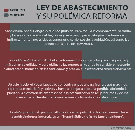 La nueva Ley de Abastecimiento, que se debatía esta noche en la Cámara de Diputados, otorga más poder a la autoridad de aplicación, al darle algunas atribuciones que en la ahora modificada Ley 20.680 quedaban reservadas al Poder Judicial, pero a la vez deroga la pena de prisión entre las sanciones a los infractores. Pero sobre todo -y lo más criticado por cámaras empresarias, en especial- significa una fuerte intervención del Estado en el ámbito del comercio.