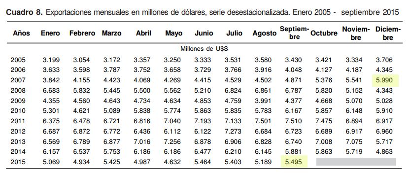 Cayó el comercio exterior en las dos presidencias de Cristina Fernández, como lo presenta este informe del INDEC, de octubre último: en diciembre de 2007, las exportaciones totalizaban U$S 5.990 millones de dólares y septiembre último, U$S 5.495 millones.
