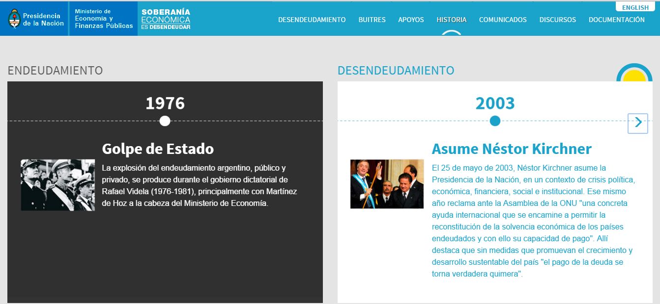 Al recorrer la cronología interactiva de la web del Ministerio de Economía aparece una etapa oscura de endeudamiento y una etapa iluminada de desendeudamiento, que arranca en 2003, con la llegada de Néstor, y en marzo de 2005 enuncia la "Salida del default", con el rostro de Néstor Kirchner. Sin embargo no dice nada de que en julio de 2014 Argentina volvió a entrar en default y aún sigue así.
