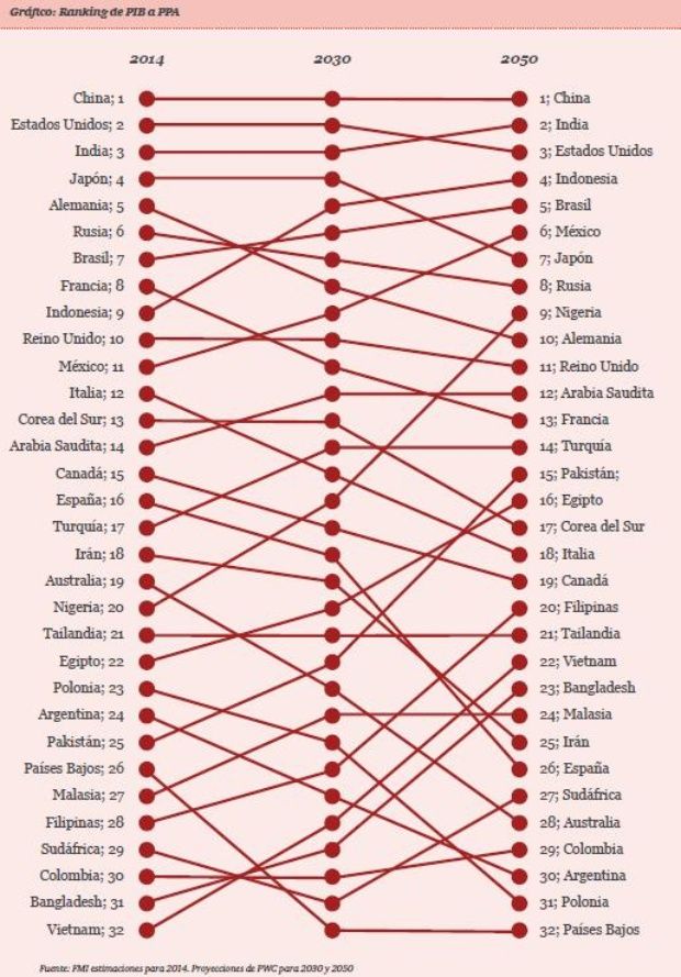 El “top ten” sería completado a mitad de siglo en el siguiente orden: Indonesia (hoy novena), Brasil (hoy séptima), México (hoy undécima), Japón (hoy cuarta), Rusia (hoy sexta), Nigeria (hoy vigésima) y Alemania (hoy quinta). Las que saldrían de entre las diez economías más grandes son Francia y el Reino Unido.