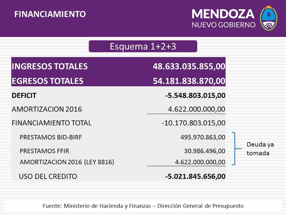 El Presupuesto contempla 18.200 millones de déficit total. Y el equipo económico del Senado indicó que los 5 mil millones de pesos que se necesitan son parte del próximo ejercicio, en tanto que en la ley 8.816 se autorizaron 4.600 millones (que aún no se consiguen), y recientemente el gobernador Alfredo Cornejo recibió un préstamo del Banco Nación de 2.200 millones que se utilizaron para pagar los salarios de los estatales.