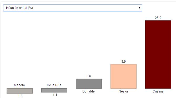 El 25% de la barra roja (Cristina) es la interanual de octubre del IPC Congreso. La inflación del Indec (interanual) arroja en 14,3%.