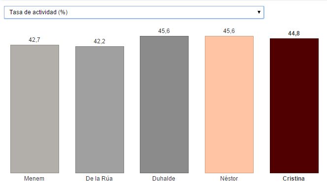 Empleo estancado. Si revisamos las tasas de actividad y empleo, la situación ha mejorado un poco respecto del último año de la era menemista. El dato acá es que no hubo una evolución pareja en los 12 años de ciclo kirchnerista. De hecho que la tasa de actividad hoy es menor que el de hace 12 años.