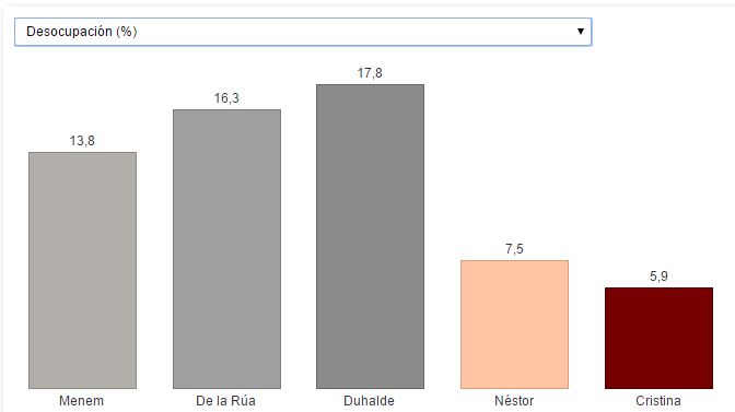 Los siguientes gráficos corresponden a los últimos años de las presidencias de Carlos Menem (1999), Fernando De la Rúa (2001), Eduardo Duhalde (2003), Néstor Kirchner (2007) y Cristina Kirchner (2015).