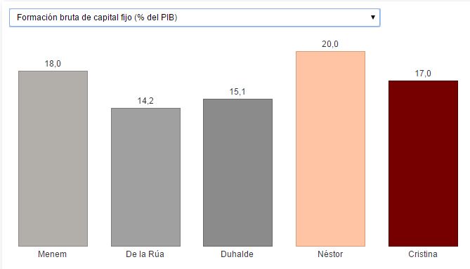 Un indicador sobre obras públicas es la formación bruta de capital fijo, que incluye ítems como adquisiciones de planta, maquinaria y equipo, construcción de rutas y autopistas, ferrocarriles y obras afines, como también escuelas, oficinas, hospitales, viviendas residenciales privadas, y los edificios comerciales e industriales. En este indicador, Cristina deja al país prácticamente igual que Menem, pese a que Néstor había logrado una notoria mejoría.