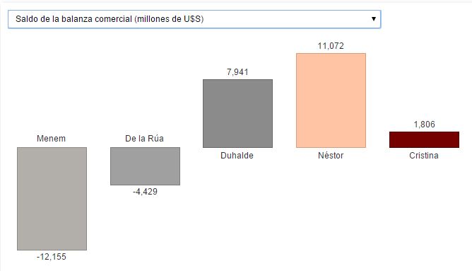 Retroceso en el comercio, campo e industria. Menem cerró su gestión con un rojo de -12.155 millones de dólares en la balanza comercial. La promesa del kirchnerismo fue revitalizar la producción nacional y generar empleo. Así logró inclinar la balanza comercial hacia el superavit: Néstor le entregó a su mujer (en 2007) un superavit de 11.072 millones de dólares. Luego vino el cepo, las retenciones, presión impositiva récord y las trabas a las importaciones, que terminó debilitando al campo, la industria y el comercio. De este modo, si bien el kirchnerismo en líneas generales mejoró la situación, fue más evidente el retroceso comercial de los últimos años, que terminó desdibujando lo que ellos llamaron "el modelo".