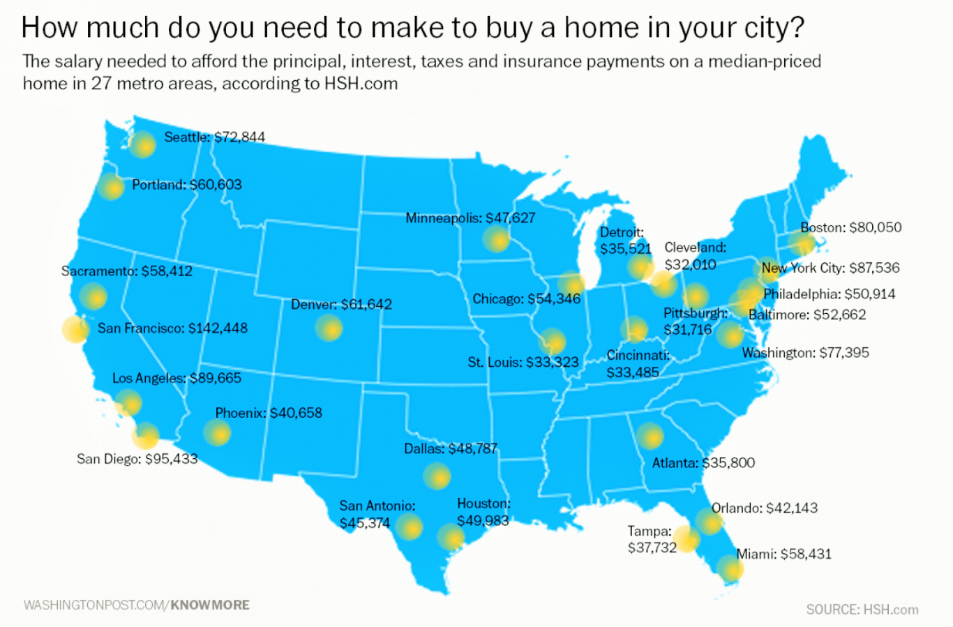 Según el siguiente mapa, se necesita mayores ingresos para acceder a una vivienda en San Francisco, San Diego, Nueva York, Boston y Seattle, Y en el otro extremo, Cleveland, Pittsburd, Cincinnati, St Louis, Atlanta y Tampa.