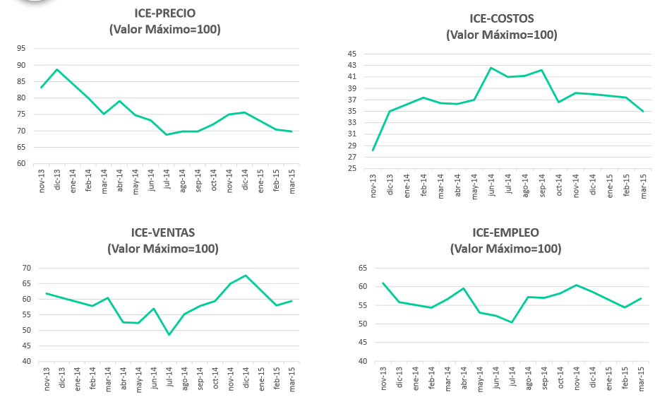 Ventas es uno de los indicadores que registra esta medición. Los otros son precio, costos, empleo e inversiones. Con un valor máximo de 100, el indicador Ventas (58,23%) se correlaciona con el indicador Empleo (56,37%). Si crece la confianza en las las ventas, lo mismo sucede con el empleo.