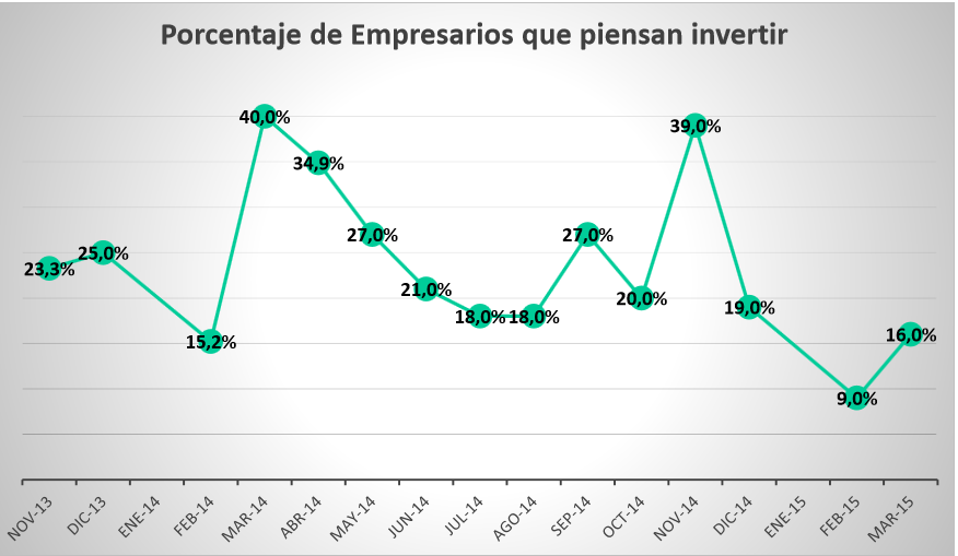 Y llegamos al dato más duro: luego de tocar fondo en febrero último (9%) y con un leve repunte en marzo, sólo el 16% de los empresarios piensa invertir. El siguiente gráfico -que arranca en noviembre de 2013- refleja con claridad el pesimismo que hay en invertir: