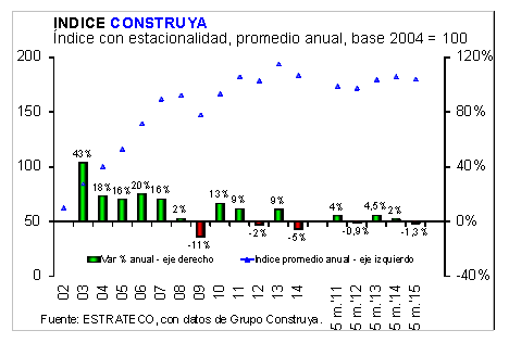 Respecto al Índice Construya, que mide los despachos en volumen de las empresas que integran el Grupo Construya para obra residencial, se multiplicó por un factor de 3,4 entre 2002 y 2015 (+240,0%), el ingeniero Brandi sostuvo: “se puede observar que en los primeros cinco meses de 2015 el índice se mantuvo en un nivel muy elevado en términos históricos, quedando apenas 1,3% por debajo del récord alcanzado en 2013”.