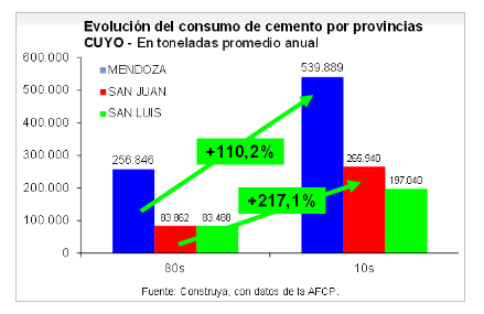 Además, en referencia al consumo de Cemento Portland dentro de CUYO, agregó que Mendoza es la provincia que más demanda, en tanto que SAN JUAN fue la que más dinamismo exhibió, seguida por San Luis. “En Mendoza el consumo de cemento se duplicó en estos años con relación al de los ‘80, llegando a 540 mil toneladas por año. En tanto, en San Juan se triplicó y llegó a un promedio anual de 266 mil toneladas, impulsado por el fuerte desarrollo de la minería” expresó Brandi.