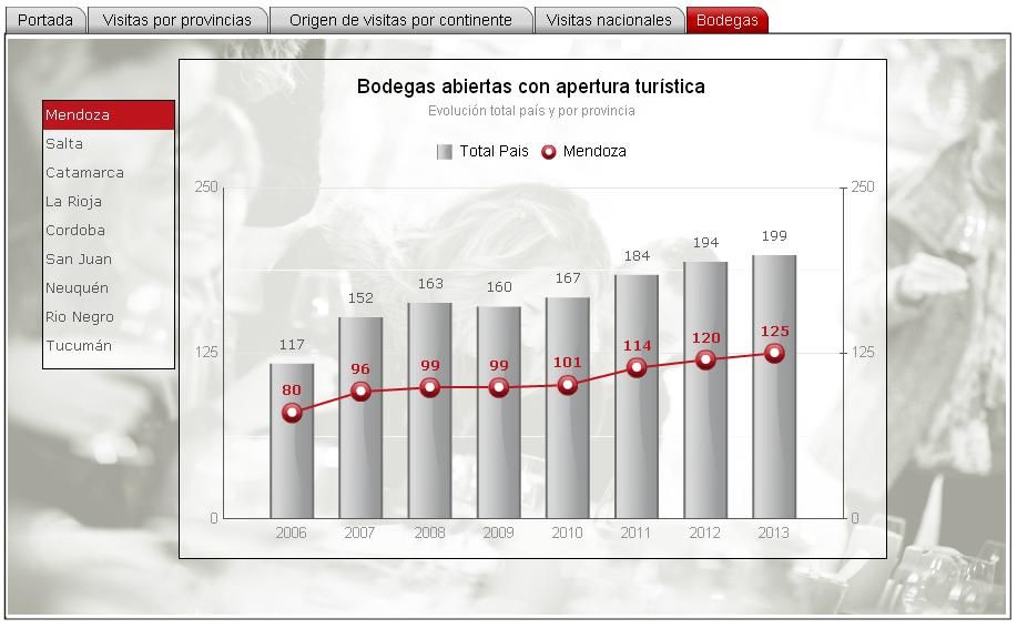 En el mismo documento se indica que el crecimiento, si bien se mantuvo, fue más moderado que durante los años 2011, 2012. Igualmente, se advierte que en el año 2013 se logró un máximo histórico desde 2004, registrándose una cantidad de 1.445.754 visitas enoturísticas en Los Caminos del Vino (Catamárca, Córdoba, La Rioja, Mendoza, Neuquén, Río Negro, Salta, San Juan y Tucuman), y nuestra provincia registró 1.021.489 visitantes, contra los 328.206 de 2004.